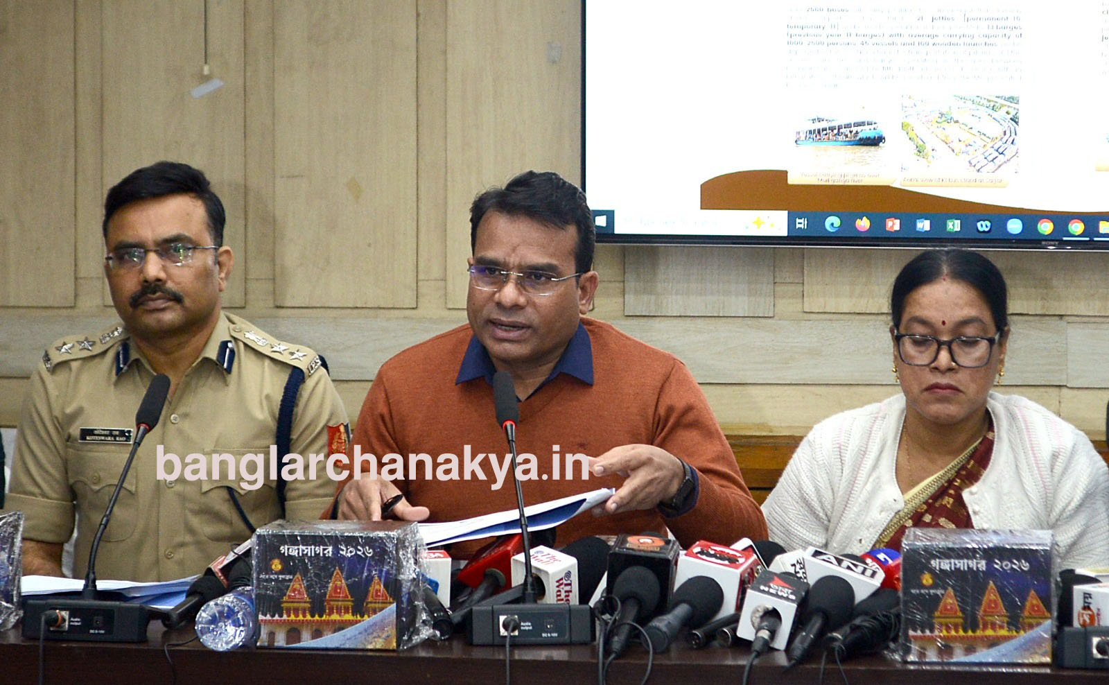 তোতন দাশ,বাংলার চাণক্য নিউজ ডেস্ক:- আর হাতে গোনা কয়েকটা দিন। আর তারপরেই গঙ্গাসাগর মেলা ২০২৬। চলতি বছর কুম্ভ মেলা না থাকায় ভিড় বাড়বে এমনই মনে করছেন প্রশাসনিক কর্তারা। ভীড় মোকাবেলার জন্য ইতিমধ্যে গত কয়েক মাস ধরেই চলছে বিভিন্ন প্রস্তুতি পর্ব, দফায় দফায় বৈঠক,পরিদর্শন ।বুধবার ৩১/১২/২০২৫বছর শেষের দিন দক্ষিণ ২৪ পরগনা জেলা সদর আলিপুরের জেলা পরিষদের কনফারেন্স হলে গঙ্গাসাগর মেলা ২০২৬ নিয়ে এক সাংবাদিক সম্মেলনের আয়োজন করা হয়। এদিন বৈঠকে উপস্থিত ছিলেন, জেলাশাসক অরবিন্দ কুমার মিনা, জেলা সমাধিপতি নীলিমা বিশাল মিস্ত্রি, সুন্দরবন পুলিশ জেলার পুলিশ সুপার কোটেশ্বর রাও, অতিরিক্ত জেলাশাসক অভনীত পুনিয়া,প্রশান্ত রাজ শুক্লা ,সাদ্দাম নাভাস, ভাস্কর পাল, সৌমেন পাল এবং দক্ষিণ চব্বিশ পরগনা জেলার তথ্য সংস্কৃতি আধিকারিক অনন্যা মজুমদার প্রমুখ।